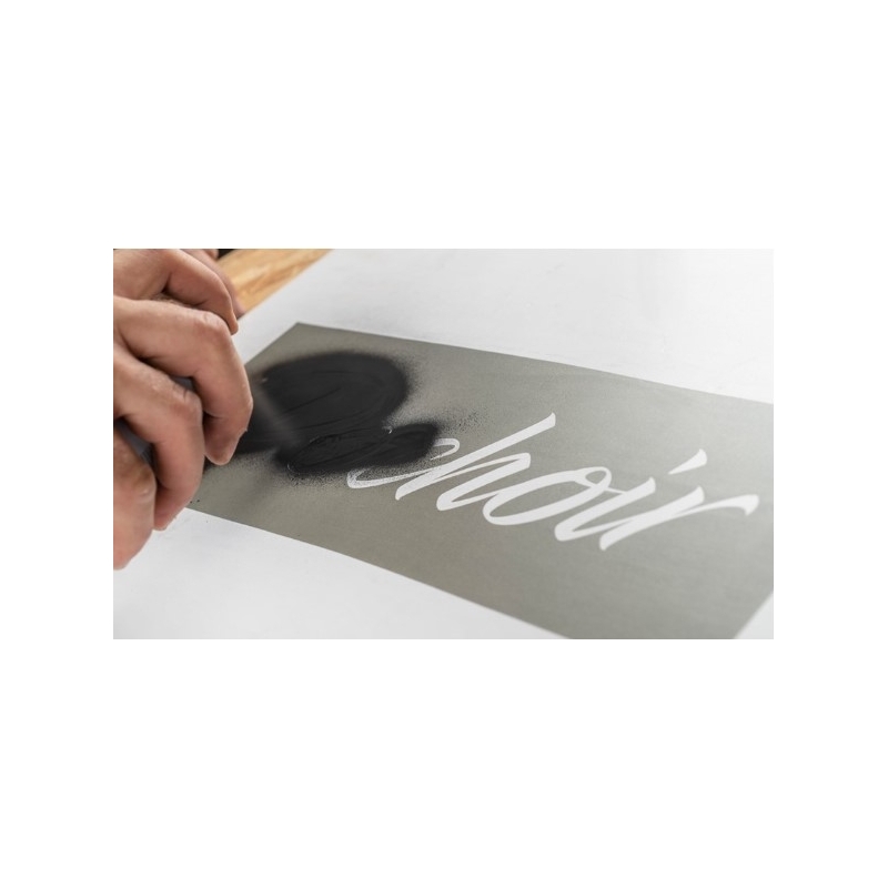 Pochoir constitué d'un PVC semi-polymère, calandré, de 80 microns d'épaisseur, enduit d'un adhésif acrylique sensible à la pression, enlevable.